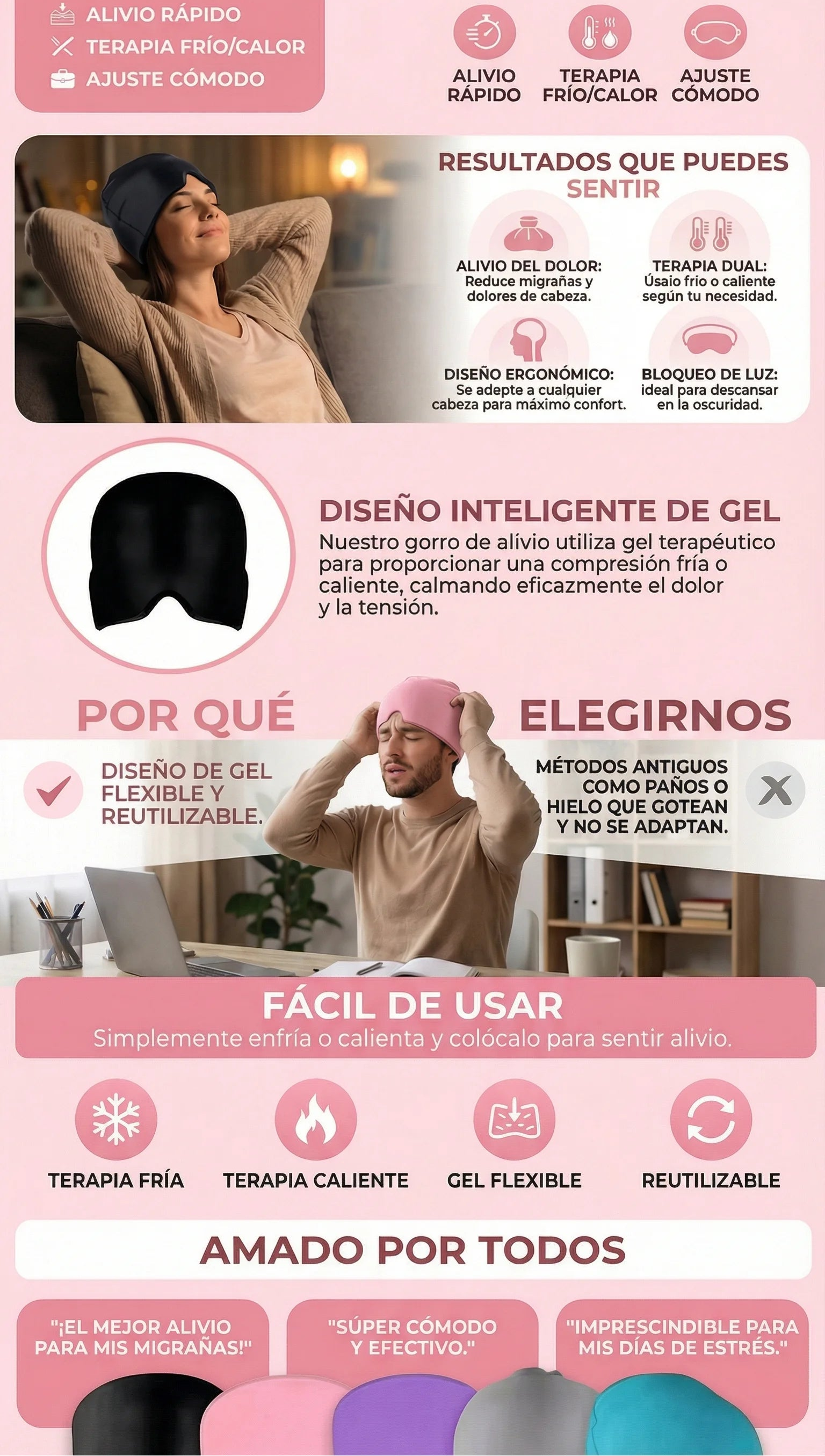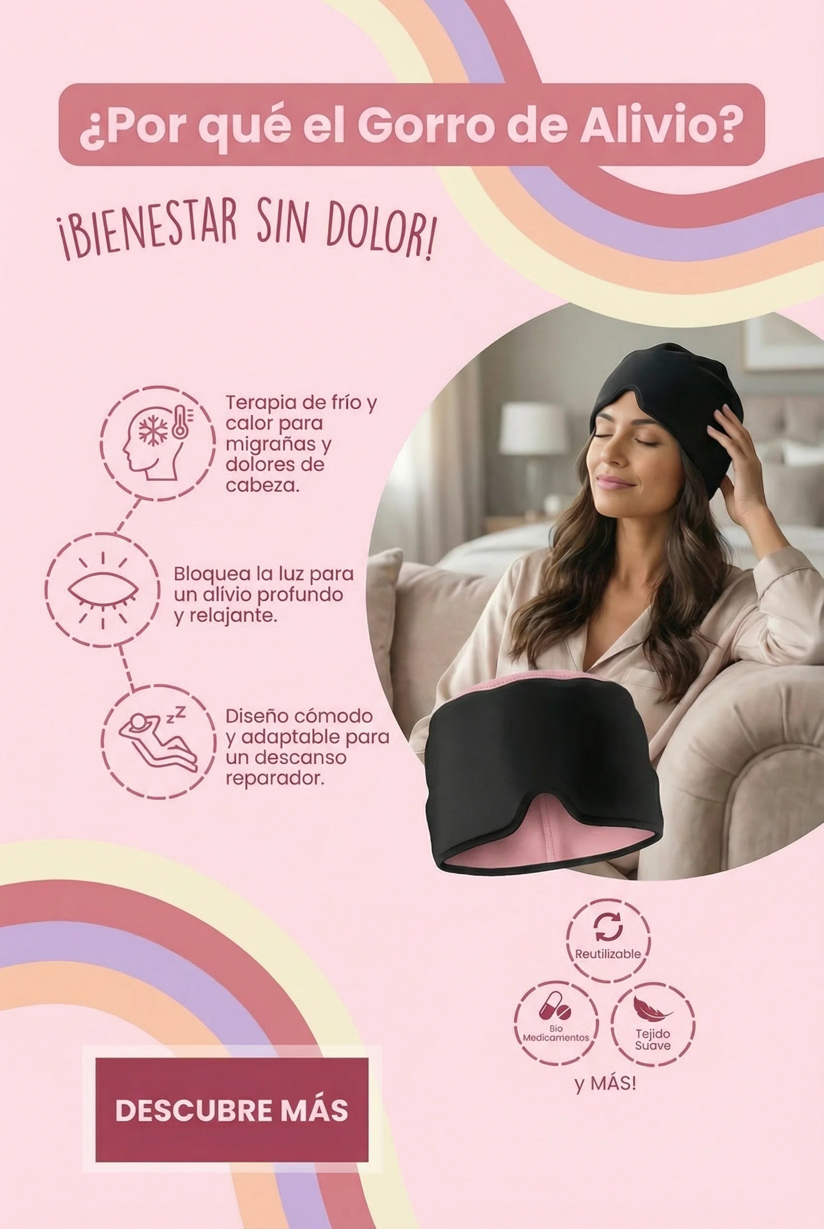 Guarda el gorro en el refrigerador la hora indicada. Colócalo sobre frente y sienes hasta 20 minutos para reducir inflamación y dolor sin medicación.