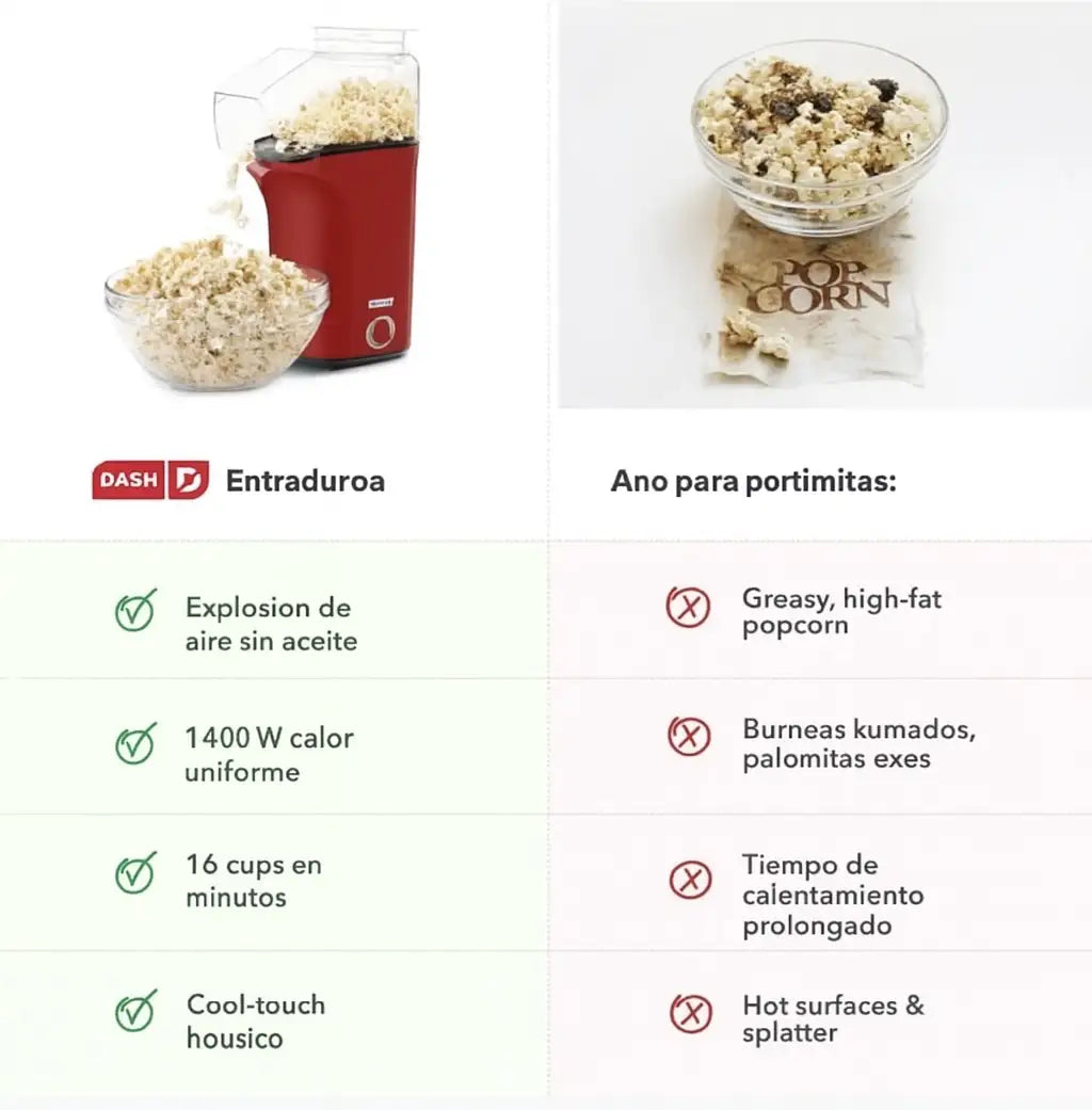 A diferencia de otras, esta máquina ofrece palomitas saludables sin aceite, es fácil de usar y rápida de limpiar, mejorando tu experiencia de snack sin esfuerzo adicional.